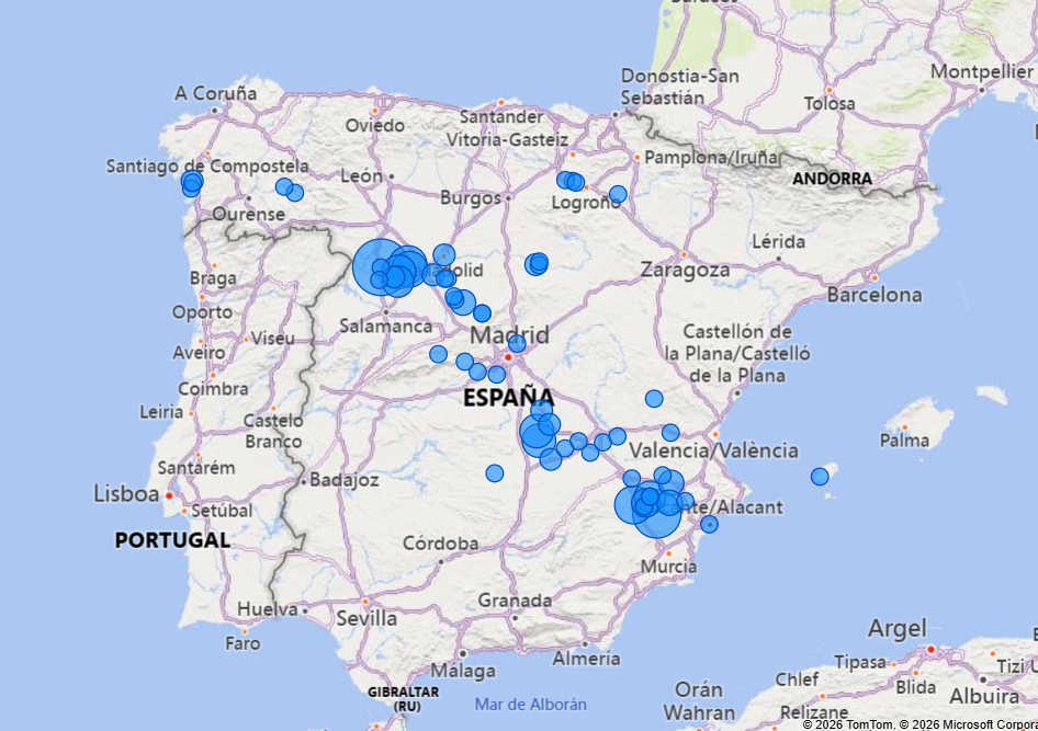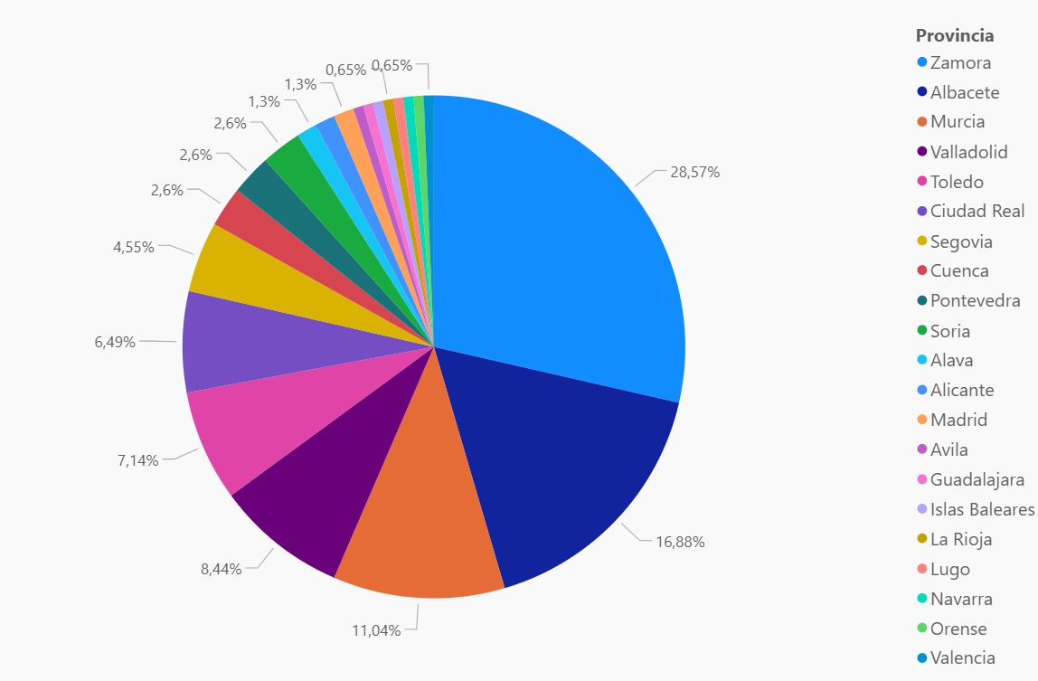 Si el análisis se lleva a nivel provincial, las referencias se reducen a 21 provincias, pero nuevamente la concentración es alta: 6 provincias acumulan más del 75% (por orden: Zamora, Albacete, Murcia, Valladolid, Toledo y Ciudad Real).