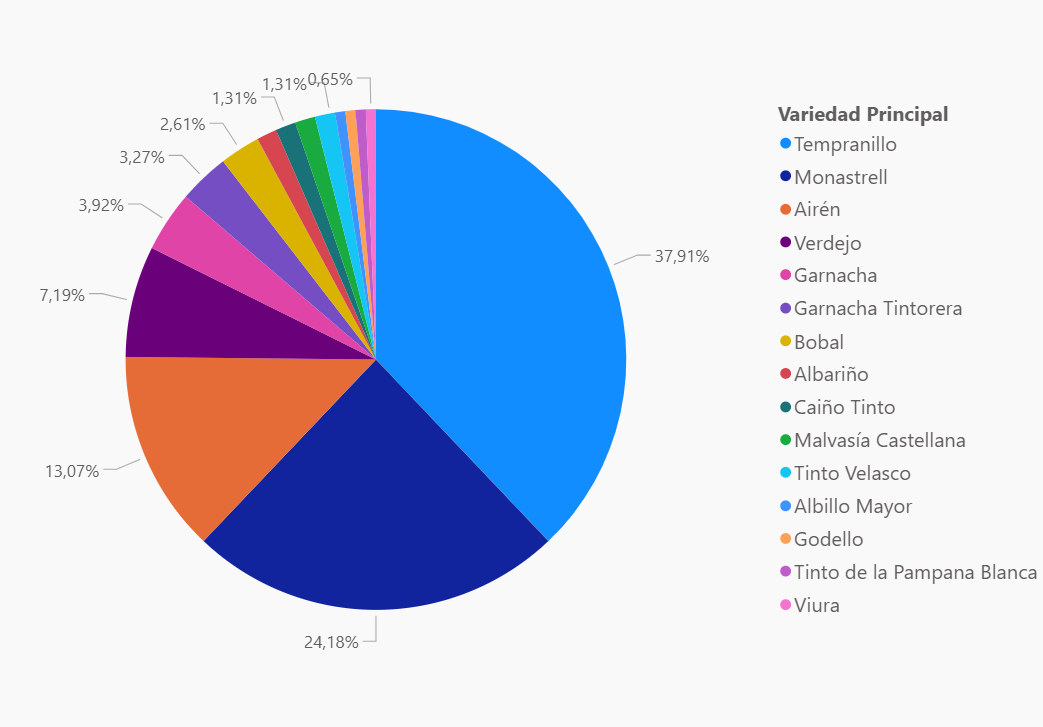 A conituación mostramos un gráfico con el porcentaje de vinos por cada una de las principales variedades de uva con las que han sido elaborados cada uno. Aunque hemos identificado 15 variedades diferentes como variedades principales de estos vinos (alguno de ellos están elaborados con la presencia minoritaria de otras variedades), solamente 4 de estas variedades suponen más del 80% de los vinos (Tempranillo, Monastrell, Airén y Verdejo). Como decíamos anteriormente, en este análisis no se incluyen los vinos elaborados en las Islas Canarias, en cuyo caso, las principales variedades de uva serían: Listán Tinto, Listán Blanca, Alarije y Negramoll.