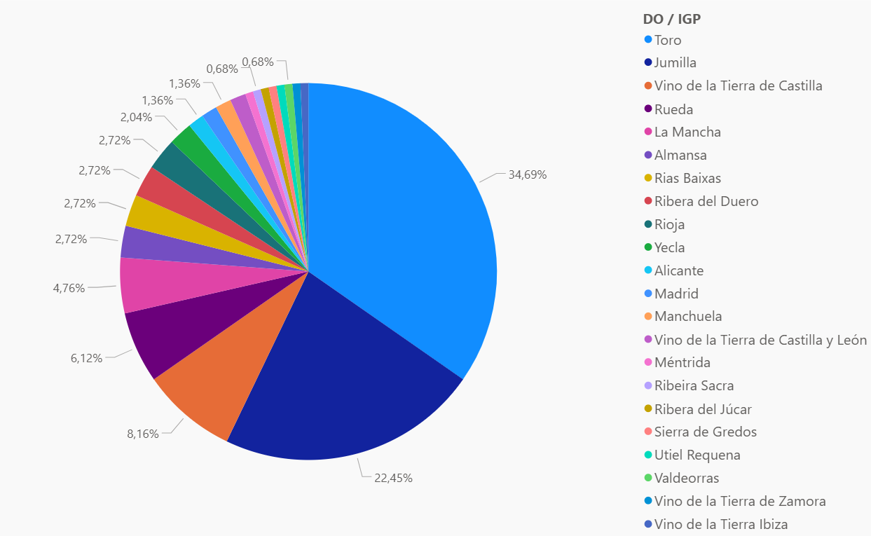 En esa distribución, la mayor concentración de referencias corresponde con las denominaciones de origen de Toro y Jumilla, en línea con las estimaciones de superficie de viñedo.